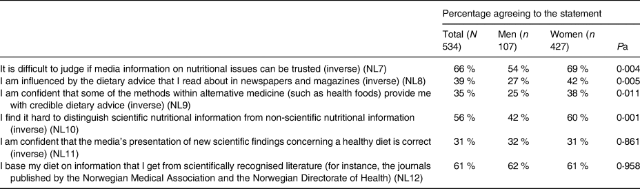 As shown in Table 3, as many as 66 % of university students and employees agreed that they found it difficult to judge if information on nutritional issues from the media could be trusted (NL7), with a higher proportion among women (69 %) than men (54 %). Similarly, considerably more women (60 %) than men (42 %) found it hard to distinguish between scientific and non-scientific information about diet (NL10). With no gender difference, 31 % were confident that the ‘media's presentation of new scientific findings concerning a healthy diet is correct’ (NL11), whereas significantly more women (42 %) than men (27 %) agreed that they ‘let themselves be influenced by the dietary advice that they read about in newspapers’ (NL8). In total, 61 % stated that they ‘base their diet on information that they get from scientifically recognized literature including the national dietary recommendations’ (NL12). Nevertheless, a significant proportion of women (38 %) compared to men (25 %) agreed that alternative medicine could also provide credible dietary advice (NL9) (Table 3).