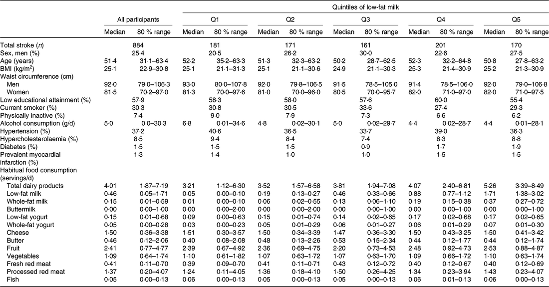 During a median follow-up of 15·2 years we identified 884 stroke cases, including 503 ischaemic, 244 haemorrhagic and 137 unclassified types. Participant characteristics across quintiles of dairy product subgroups are given in Table 1 and online Supplementary Tables S1–S6. While there were no pronounced differences in characteristics between quintiles of low-fat milk intake (Table 1), participants with a high intake of whole-fat milk or butter were more likely to be men, current smokers and have a higher alcohol intake (online Supplementary Tables S1 and S6). For both low-fat and whole-fat yogurt, those with high intakes compared with the lowest were more likely to be women and drink less alcohol and less likely to be current smokers or physically inactive. Moreover, participants with a high intake of yogurt had higher intakes of fruit and vegetables and lower intakes of red and processed meat compared with participants with the lowest intake (online Supplementary Tables S3 and S4).