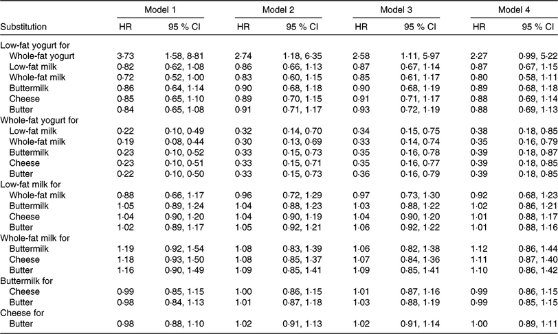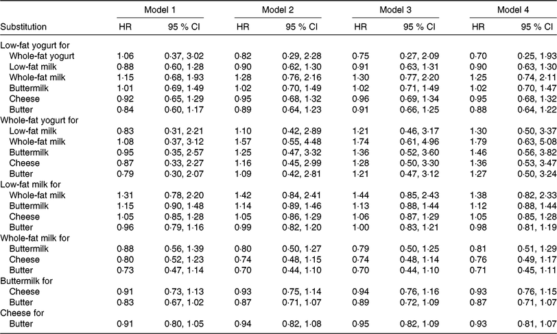Table 2. Associations for one serving/d substitutions between dairy products and risk of ischaemic stroke in the European Investigation into Cancer and Nutrition-Netherlands (EPIC-NL) cohort*