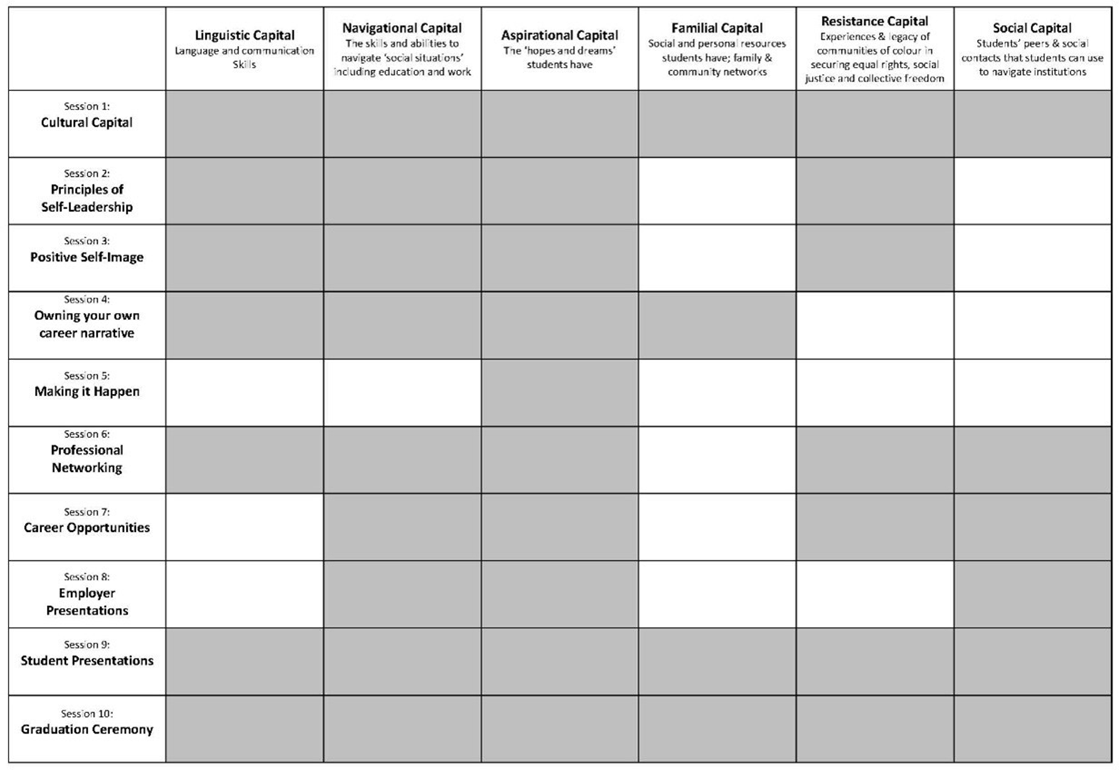 We utilised Yosso’s cultural wealth model (Yosso, Reference Yosso2005) to enable students to identify and leverage the cultural wealth innate to them and their cultural backgrounds. In so doing we rejected the negative preconceptions inherent in the ‘deficit thinking’ which we had encountered in relation to AAMG staff and students. The concept of cultural wealth was reinforced throughout the programme, as illustrated in Figure 1. The greyed-out boxes represent how each session reinforced different aspects of Yosso’s cultural wealth.