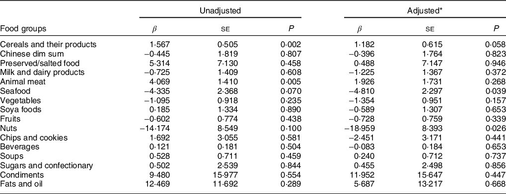 Table 3 shows the multiple linear regression analysis for urinary Na excretion using sex, age, BMI and dietary energy intake as covariates. Higher intake of seafood (β = −4·810, se = 2·297, P = 0·039) and nuts (β = −18·959, se = 8·393, P = 0·026) were associated with lower urinary Na excretion in the adjusted model. Higher intakes of cereals and their products and animal meat were associated with higher urinary Na excretion in the unadjusted model; however, the associations were not significant after adjusting for age, sex, BMI and daily energy intake. Intake of other food groups was not associated with urinary Na excretion.