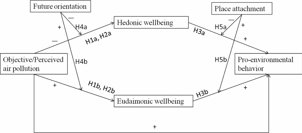 The present study is interested in: (1) how air pollution affects daily mental experience (we focused on two types of wellbeing: subjective wellbeing [SWB] and eudaimonic wellbeing [EWB]) in ordinary Chinese people; (2) whether the above-mentioned effect pushes people to take action for environmental protection; (3) whether the link between air pollution, wellbeing, and pro-environmental behaviour (PEB) has individual differences drivers (we focused on the two individual difference variables of future orientation and place attachment).