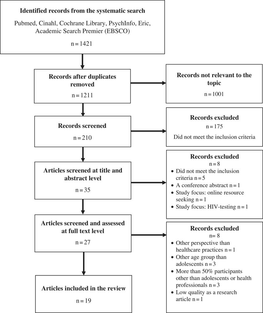 In the problem identification stage, a clear aim for the review was defined to support the following stages (Whittemore and Knafl, Reference Whittemore and Knafl2005). The aim was to describe the encounters with SGM youth in healthcare based on existing research, and, to make a comprehensive review, no time limit regarding publication date was set.