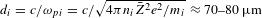 $d_{i}=c/\unicode[STIX]{x1D714}_{pi}=c/\sqrt{4\unicode[STIX]{x1D70B}n_{i}\bar{Z}^{2}e^{2}/m_{i}}\approx 70{-}80~\unicode[STIX]{x03BC}\text{m}$