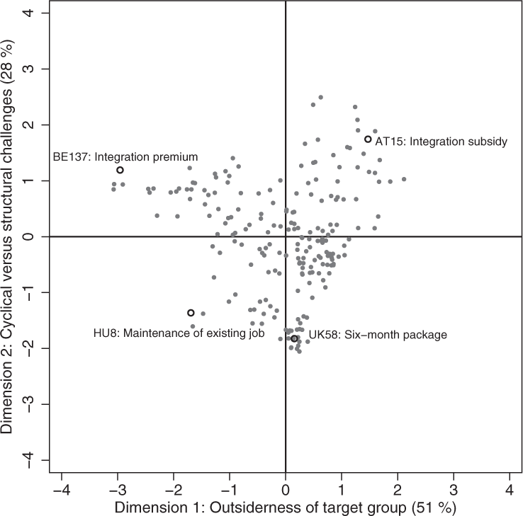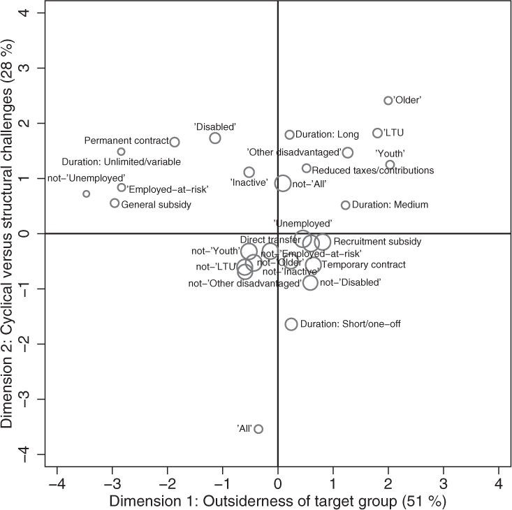 The second (vertical) dimension accounts for 28 percent of the variation in the data. Here, 10 categories make an above-average contribution. Above the origin are ‘Older’, Duration: Long, ‘Long-term unemployed’, ‘Disabled’, Permanent contract, ‘Other disadvantaged’, and not-’All’. Below the origin are ‘All’, Duration: Short/one-off, and not-’Disabled’. For two reasons, I suggest that this dimension is best understood as indicating whether a program is targeted more at counteracting long-term, structural labor market challenges or, alternatively, short-term, cyclical problems caused by economic downturns.Footnote 5