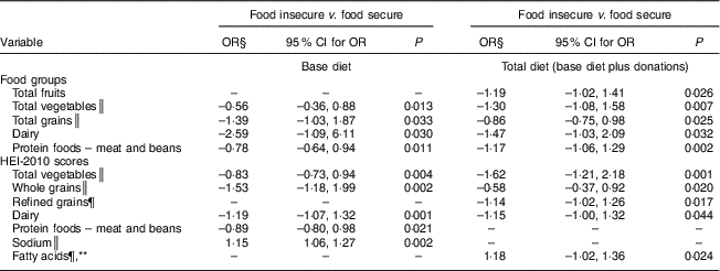 § OR measures the association between CFSM total score and the predictors (food groups and HEI-2010 scores of the base and total diets), where food secure is the reference. A positive OR indicates greater CFSM score, and thus lower food security. A negative OR reflects lower CFSM score, and thus better food security.