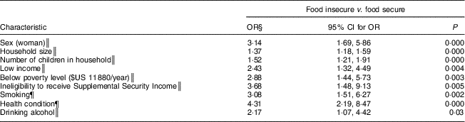 † Food security evaluated with the Core Food Security Module (CFSM). CFSM score ranges between 0 and 10 for a household without children, and from 0 to 18 for a home with children. A lower score represents greater food security( Reference Kempson, Keenan and Sadani 27 ).