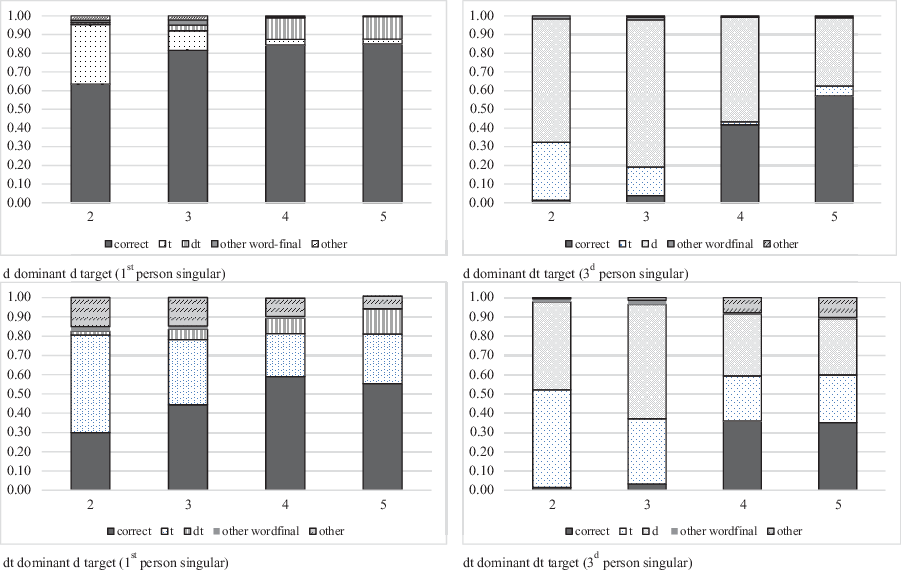 Viewed from the perspective of form, the figures in the left-hand column show the first person singular (d-target) outcomes. The correct scores differ between targets that are d- (top) or dt-dominant (bottom), but the errors are predominantly t-errors in lower grades and include -dt errors in higher grades. For -dt dominant targets, there is a larger proportion of “other” errors. For third person singular targets (-dt), shown in the right-hand column, the correct scores remain low, for both d- and dt-dominant targets, but the error pattern is slightly different: for d-dominant targets, the errors change to predominantly d-errors in higher grades, whereas for -dt dominant targets, the errors include -t as well as -d errors.