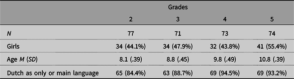 Information on number of participants, gender distribution, and language background is provided in Table 1. Children from Grades 2–5 participated in this study, 298 children (48% girls) in total, with a mean age of 9.3 years (SD = 1.2 years). The grades thus spanned almost the entire primary school range, as only Grades 1 and 6 children were not included. In the Dutch primary school literacy curriculum, spelling approaches are always direct and explicit. This is also true for present tense verb spelling, which is taught in Grade 4. The children attended one of four schools in the Randstad area, the urbanized part of the Netherlands. The majority of children spoke Dutch as their only language. Children who also spoke another language at home all received spelling instruction in Dutch at school.