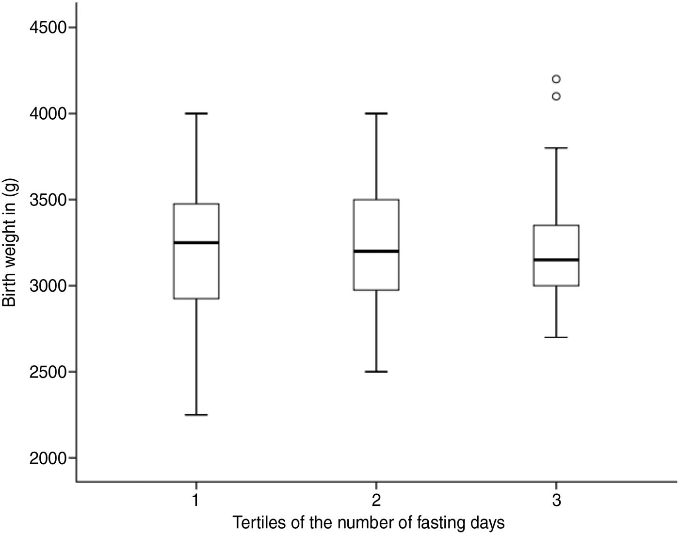 Within women who were exposed to Ramadan during their pregnancy, comparison of their newborns' birth weight was made according to the fasting status. Average birth weight of babies who were exposed to Ramadan fasting during pregnancy was 3201·5 (sd 377·6) g and 3190·6 (sd 606·7) g in babies who were not. As shown in Table 3, birth weight of newborns of the fasted women was not significantly different from those who did not fast, both in the crude and adjusted analysis. Although not statistically significant, trimester-specific analysis shows a trend towards reduced birth weight with fasting, especially in women who fasted in the second and third trimesters. Furthermore, within fasted women, we also explored if birth weight differed according to fasting intensity. Fig. 2 shows a boxplot that illustrates the association between tertiles of fasting days with newborn birth weight. The first tertile of fasting days consists of women who fasted for 1 to 8 d, while the second and third tertiles include women who fasted for 10 to 23 and 24 to 30 d.