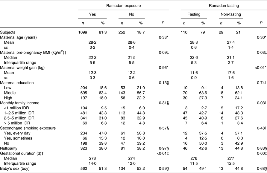 Table 1. Baseline characteristics of women based on Ramadan exposure and their fasting status