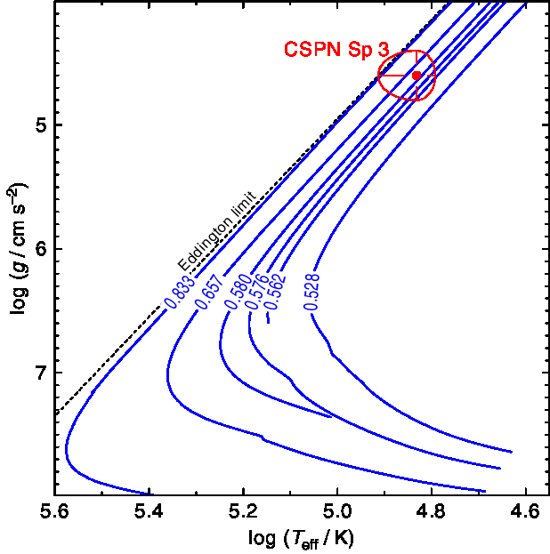 $\log g=4.6\pm0.2$. Interpolation with the H-rich stellar evolutionary tracks of Miller Bertolami (Reference Miller Bertolami2016) shows that the central star is relatively close to the Eddington limit with
