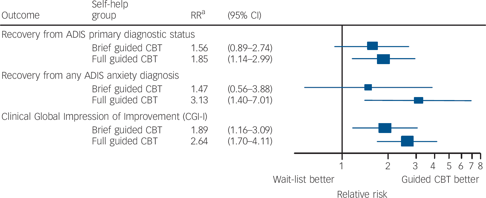 ADIS, Anxiety Disorders Interview Schedule; CBT, cognitive-behavioural therapy; RR, relative risk. a. Adjusted for gender, age, ADIS primary diagnosis and ADIS clinician severity rating.