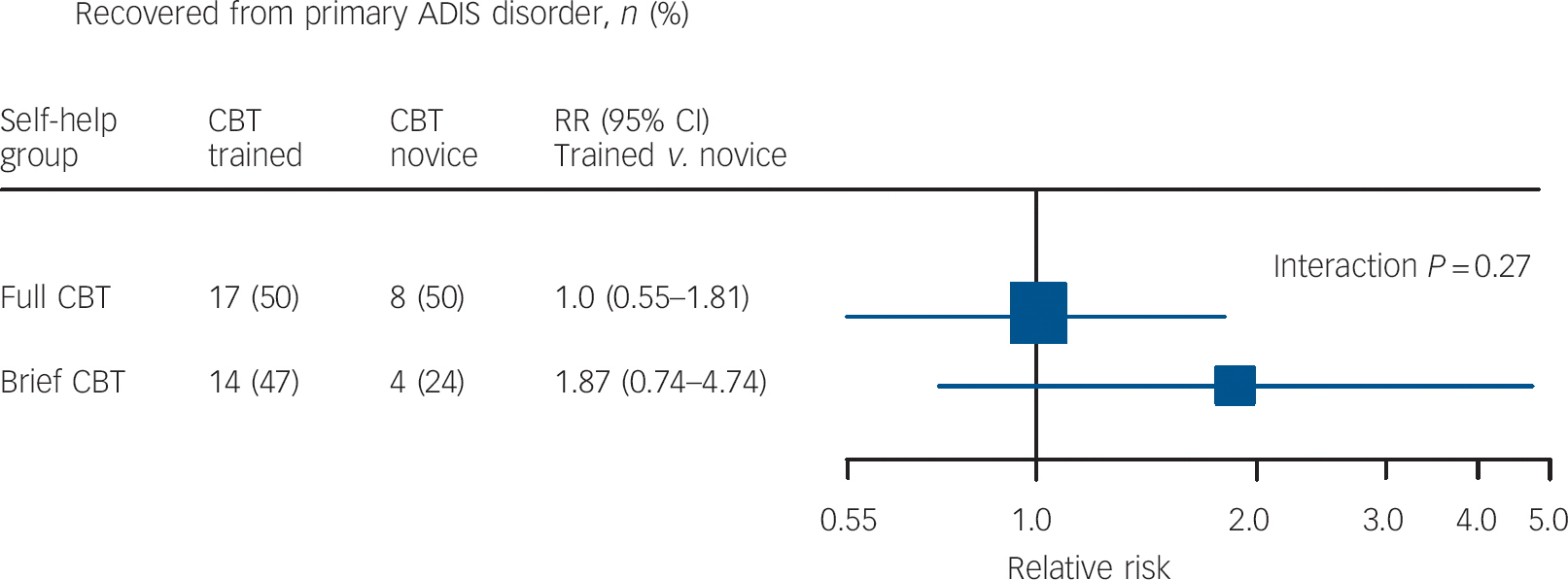 Fig. 3 Therapist effect on recovery from primary Anxiety Disorders Interview Schedule (ADIS) diagnosis post-treatment. CBT, cognitive-behavioural therapy; RR, relative risk.