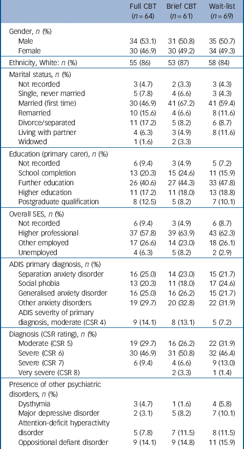 ADIS, Anxiety Disorders Interview Schedule for DSM-IV; CBT, cognitive-behavioural therapy; CSR, clinical severity rating; SES, socioeconomic status.