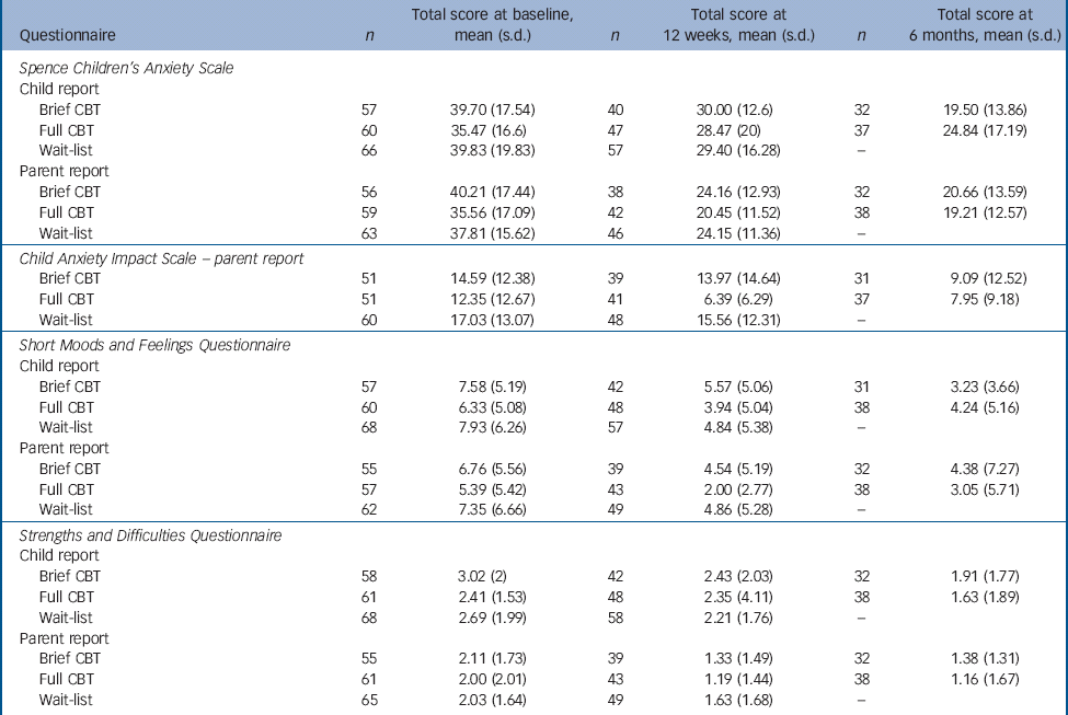 There were no differences between either full or brief guided parent-delivered CBT and the wait-list group on any child self-report questionnaire measure of anxiety or comorbid symptoms of low mood or behavioural problems (all P-values >0.37); and nor did the groups differ in terms of parent-reported anxiety symptoms (SCAS-P). On the basis of parent report post-treatment, compared with the wait-list group, for those who had received full guided CBT, there was a significantly greater reduction in the impact of anxiety (CAIS-P difference in change from baseline −5.56 (95% CI −9.40 to −1.73), P = 0.0045) and symptoms of low mood (SMFQ difference in change from baseline −1.44 (95% CI −2.82 to −0.07), P = 0.0395). No significant differences were observed between the brief guided CBT group in comparison to the wait-list group on any parent- or child-report questionnaire measures. A summary of means and distributions is provided in Table 3, together with information on change at the 6-month follow-up in the two treatment groups on questionnaire measures of anxiety and comorbid symptoms.