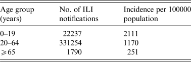 The incidence of ILI notifications, as reported via weekly aggregated reports, was highest in the youngest age group (0–19 years); 2% of the Croatian population in that age group had clinical influenza. ILI incidence in the 20–64 years age group was 1170/100 000 population, meaning that 1% of the Croatian population in that age group had clinical influenza. The lowest incidence was in persons aged ⩾65 years (0·25% of that age group had clinical influenza) (Table 1).