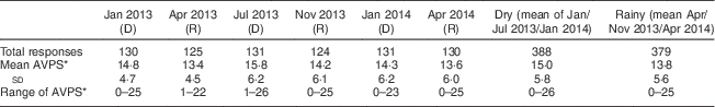 The HFSSM, developed by the USDA, was selected to measure FI as it is has been validated for use among vulnerable and Indigenous populations( Reference Bickel, Nord and Price 41 ). We used a 3-month recall period and employed both the standard USDA scoring system (to allow comparison with international research employing this method) and an alternative Adapted Vulnerability Population Score (AVPS) developed by Patterson( Reference Patterson 20 ) for this population (to capture greater variation in FI) in our analyses of seasonal variation. While the USDA scoring system provides four categorical outcomes for FI (i.e. high, marginal, low and very low food security), the AVPS uses a 26-point scale to capture variation along a continuous gradient.