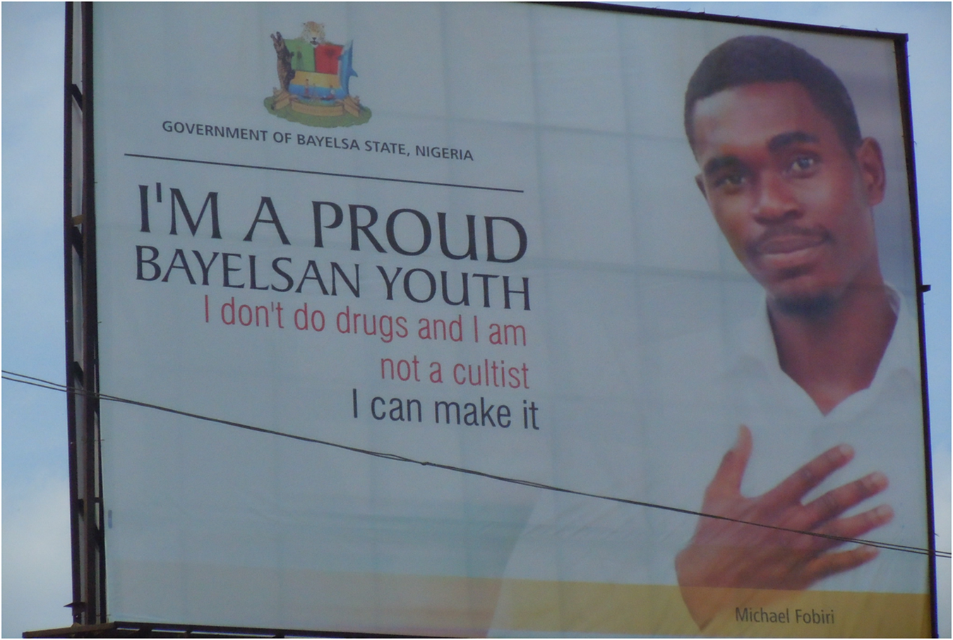 In May 2013, the billboard below (Figure 1) greeted travelers entering Yenagoa, Bayelsa State. The wholesome young man pledges to avoid drugs and cult groups. His is an optimistic image of Delta youth. Whereas the billboard displays hope, the residents’ continued destitution has contributed to violence, desperation, and drug abuse. Adunbi (Reference Adunbi2015) emphasizes the local belief that oil companies excluded the Niger Delta’s youth from employment, education, and opportunities while extracting incredible riches for shareholders of international corporations headquartered in Europe and North America.