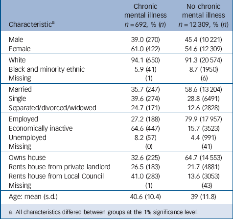 | Characteristic a | Chronic mental illness n = 692, % (n) |