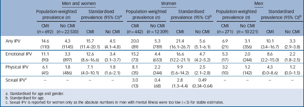 Among women, the population-weighted prevalence of past-year IPV was 20.0% (89/442) v. 5.3% (789/12 309) among those with and without CMI, respectively, and the age/gender standardised prevalence was 21.4% v. 5.6%, respectively (Table 2). Among men, the IPV population-weighted prevalence was 6.9% (21/271) v. 3.1% (356/10 221) among those with and without CMI, respectively, and the age/gender standardised prevalence was 10.1% v. 3.3%, respectively.
