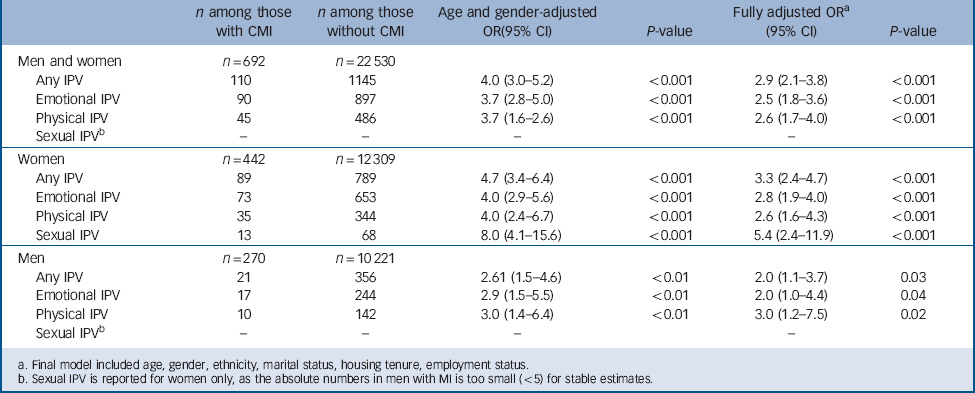 This is the first study to directly compare recent IPV (emotional, physical and sexual) among men and women with and without pre-existing mental illness. Reference Devries, Mak, Bacchus, Child, Falder and Petzold5,Reference Trevillion, Oram, Feder and Howard8,Reference Oram, Trevillion, Feder and Howard9,Reference Hughes, Bellis, Jones, Wood, Bates and Eckley20 Our findings on the prevalence and relative odds of any past-year IPV among women with mental illness are consistent with recent systematic reviews. Reference Devries, Mak, Bacchus, Child, Falder and Petzold5,Reference Trevillion, Oram, Feder and Howard8,Reference Hughes, Bellis, Jones, Wood, Bates and Eckley20 We extend previous findings by reporting an excess risk in men as well as in women with mental illness; and an excess risk for all forms of IPV, including emotional and sexual IPV. The findings on emotional IPV are important, since there is evidence that emotional IPV may lead to greater health problems than physical IPV, Reference Jewkes21–Reference Mechanic, Weaver and Resick23 whereas most research and clinical enquiry is focused on the latter. We found that the greatest relative odds were for sexual IPV against women, which were increased fivefold, with 3 in 100 women with CMI reporting past-year sexual violence by a partner. These findings suggest that health professionals should enquire about all forms of recent IPV, including emotional and sexual abuse, among people with CMI.