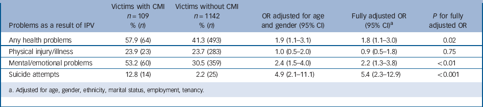 Comparing health problems for victims with and without pre-existing CMI, the former were more likely to experience emotional/mental problems within the past year as a result of IPV (53% v. 30%; OR adjusted for socio-demographics = 2.2, CI = 1.3–3.8), with particularly high relative odds for attempted suicide as a result of IPV (13% v. 2%, aOR = 5.4, CI = 2.3–12.9; Table 4). The two groups were equally likely to experience physical injuries/illness following IPV (24%, P = 0.97).