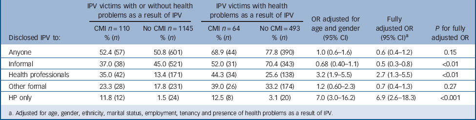 In a large, nationally representative crime survey in England and Wales, and comparing people with and without CMI of more than 1 year's duration; the population-weighted prevalence of being a victim of any IPV in the past year was 20.0% v. 5.3% among women and 6.9% v. 3.1% among men. After adjusting for socio-demographics, we found that people with CMI were two to five times more likely to experience emotional, physical and sexual IPV as those without (with a trend for higher odds among women than men). The highest relative odds were found for sexual IPV against women; 30 in 1000 women with CMI reported sexual assault by a partner in the past year compared to 4 in 1000 of women without CMI (with adjusted relative odds of 5.4). Victims with CMI were twice as likely to experience mental or emotional problems and five times more likely to attempt suicide as a result of this IPV than victims without CMI. Whilst there was no difference in overall disclosure rates between victims with and without CMI, the former were half as likely disclose IPV to informal social networks, but twice as likely to disclose it to a health professional. Most victims disclosed their experiences of IPV to multiple parties, but around 10% of IPV victims with CMI (and 1.5% of those without) disclosed exclusively to a health professional.