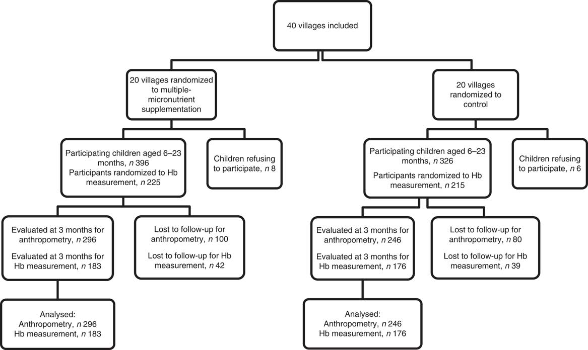The mean difference in Hb change to be detected was estimated to be 0·5 g/dl with an sd of 1·05 g/dl, with intra-cluster correlation coefficient being 0·016( Reference Barth-Jaeggi, Moretti and Kvalsvig 19 , Reference Jack, Ou and Chea 20 ). To detect this difference at significance level of 0·05 with a power of 80 %, the estimated sample size per group was 107 subjects. The formula used was the same as that for weight gain. It was planned to randomly choose twenty children per village to reach a sample of 400 children, which would remain sufficient taking account of a loss to follow-up of 20 %. The sample size required to show a decrease in the prevalence of anaemia of 31 %( Reference De-Regil, Suchdev and Vist 14 ) (from 85 to 59 %) in the intervention group was 159 subjects in each group, taking an intra-cluster correlation of 0·19 into account( Reference Ngnie-Teta, Receveur and Kuate-Defo 21 ).