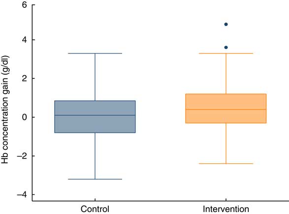 Fig. 3 (colour online) Box-and-whisker plots showing gain in Hb concentration at endline (after 3 months), by study group, among children aged 6–23 months (n 359), Nioro Circle, Mali, January 2016. The bottom and top edge of the box represent the 25th and 75th percentile (interquartile range); the line within the box represents the median; the ends of the bottom and top whiskers represent the minimum and maximum values; and the dots represent outliers