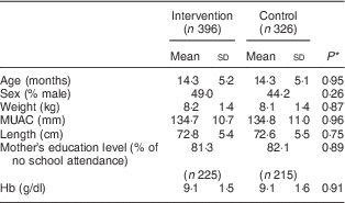 Table 1 shows that intervention and control groups of children were comparable in terms of age, sex, anthropometric measurements, education level of mother and Hb concentration at baseline. The mean Hb concentration at baseline was 9·1 g/dl in each group.