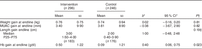 Table 2 shows that supplementation had no significant effect on growth (anthropometric measurements). Indeed, the mean weight gain was similar in the intervention and control groups (0·76 and 0·74 kg, respectively), as was the MUAC gain (3·4 and 3·8 mm, respectively). However, there was a median gain of 3·0 cm in length in the intervention group compared with 2·0 cm in the control group, but the difference was not statistically significant.