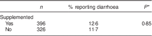 Table 3 Proportion reporting diarrhoea during the intervention, by study group, among children aged 6–23 months (n 542), Nioro Circle, Mali, January 2016