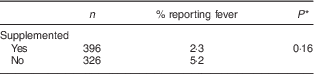 The proportion of children who had at least one episode of fever during the follow-up (Table 4) was twice as high in the control group than the intervention group (2·3 v. 5·2 %, respectively), but the difference was not statistically significant.
