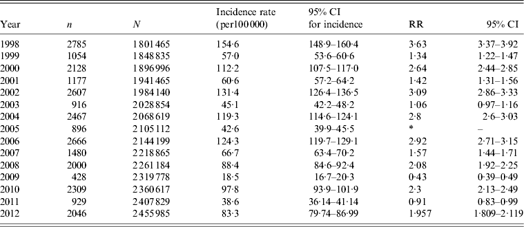 Analysis of data was performed using SPSS v. 21 (IBM Corp., USA). In addition, WINPEPI Computer Programs for Epidemiologists [Reference Abramson19] was used to calculate incidence rates/100 000 Pearson's χ2 P values and 95% confidence intervals.