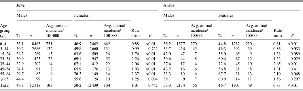 In the 0–4 years age group, the female/male risk ratio was 0·88 and 0·81 for Jews and Arabs, respectively (P < 0·001 in both populations), and significantly >1 in the 15–24, 25–34, 35–44, 45–54 and 55–64 years age groups (Table 2).