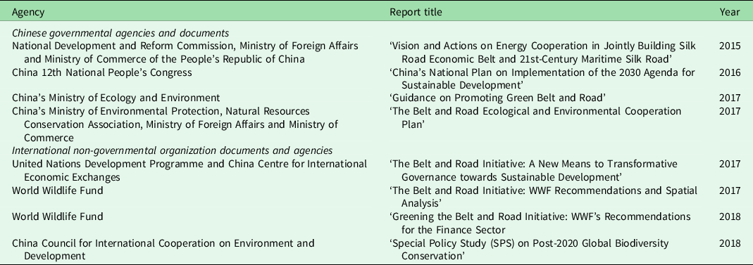 Table 1. List of Chinese government- and international non-governmental organization-issued documents pertaining to environmental protection across the Belt and Road Initiative.