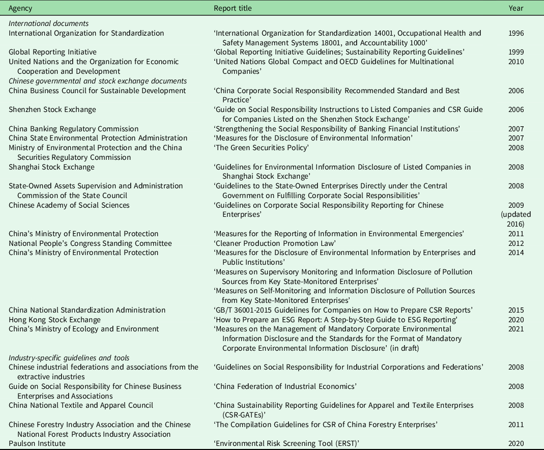 In China, environmental NGOs (non-profit enterprises, social groups, social service organizations and foundations) operate with strong formal and informal ties to the government and are subject to the standards of Chinese policies and government documents; therefore, the concept of the NGO in China is different from that in the Western conceptualization (Guttman et al. 2018). Hybrid governance arrangements are often the driving forces behind corporate environmental change and pressure for pro-environmental politics and governance. For example, they integrate influential non-state actors and NGOs, who hold different perspectives on international norms, into business activities and development planning projects (Ongaro et al. Reference Ongaro, Gong and Jing2019). The shehui tuanti (‘social associations’) serve as business associations and NGOs that have developed numerous industry guidelines (Table 2) regarding voluntary sustainability standards (Zhang Reference Zhang2021) for Chinese overseas governance over a variety of materials and contexts. Compliance with voluntary sustainability standards can be accredited by international certification companies such as Standards Technical Service Co., Ltd, which can monitor or audit degrees of compliance (Zhang Reference Zhang2021).
