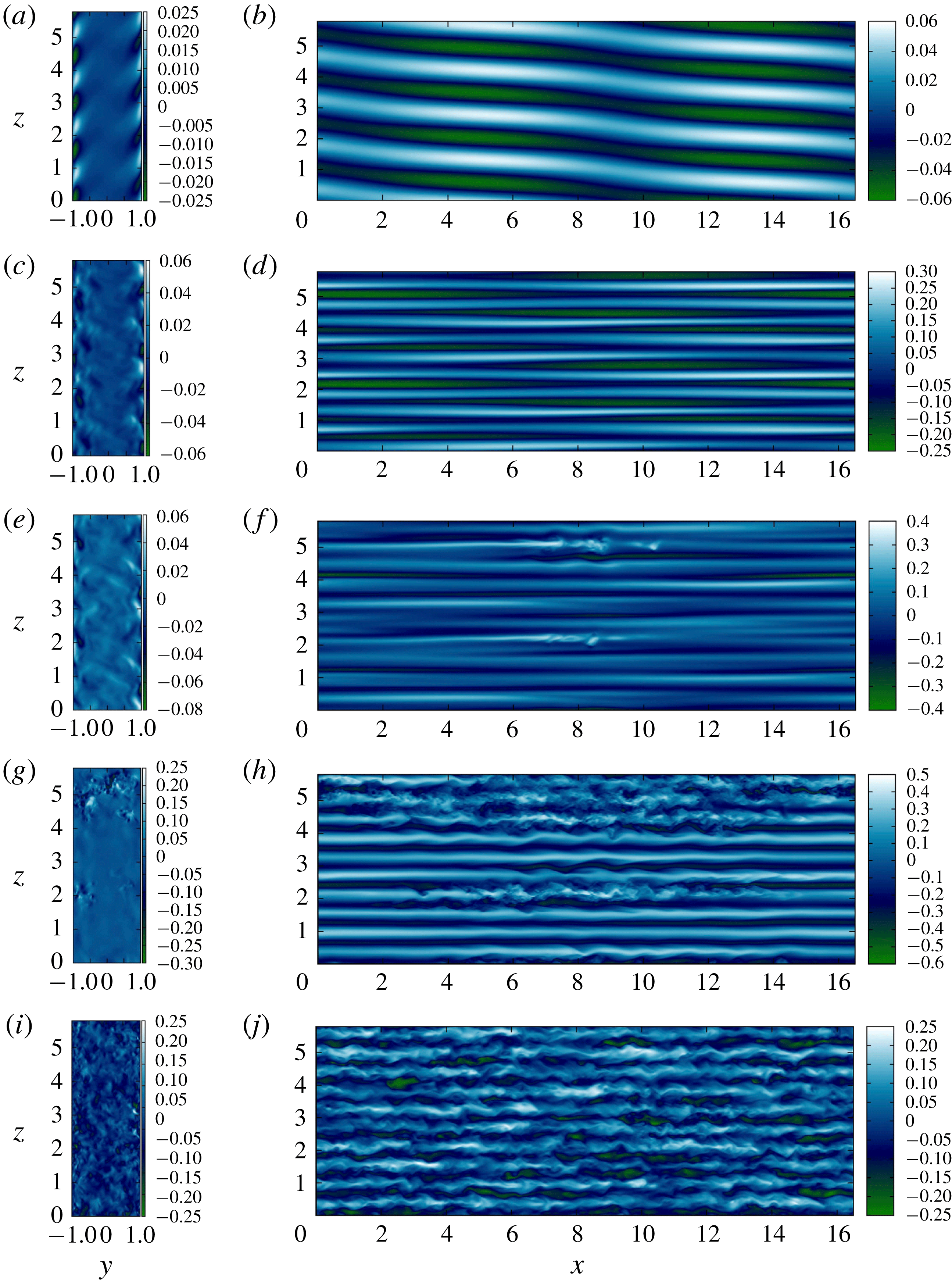 However, this is not the long-time attractor. Significantly, the finite amplitudes reached are sufficient to seed the SSP/VWI sustained turbulence which was observed in the linearly stable geometry. In other words, apparently, the linear instability simply provides another route to what appears to be the same attractor at these parameter values. This is borne out by the flow fields in figure 11 and the energetics of figure 9 (see also accompanying movie (Movie 2.gif) in the supplementary material). We find that when the local accelerations are energetic enough to give rise to overturns (as in the flow with