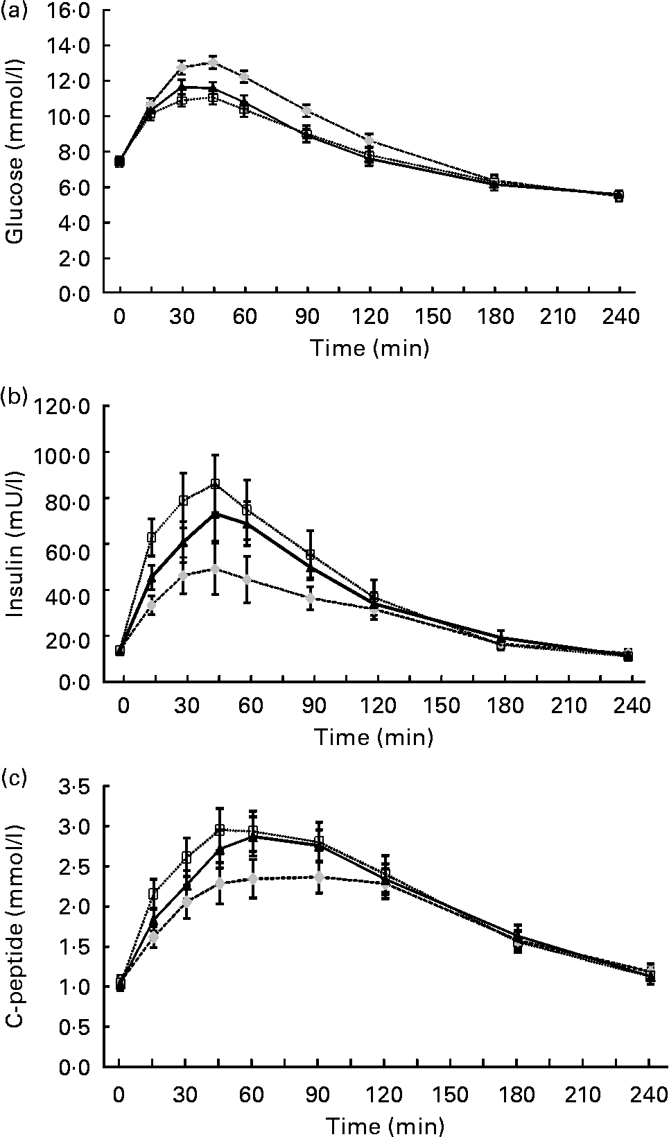 Fig. 2 (a) Serum glucose, (b) insulin and (c) C-peptide concentrations in 4 h after consumption of the control (