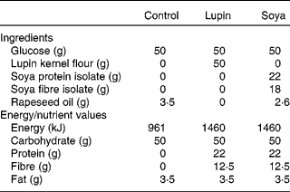 The three test beverages contained 50 g glucose (control), 50 g glucose plus lupin flour (lupin) or 50 g glucose plus soya protein and fibre isolates (soya). All three beverages were matched for total volume and carbohydrate and fat content, and the lupin and soya beverages were matched for protein and fibre content (Table 1).