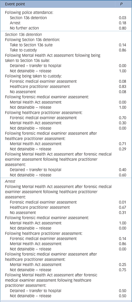 The case linkage data indicated that not all Section 136 detainees were receiving a Mental Health Act assessment despite the Mental Health Act 1983 statement that all detainees under Section 136 should receive assessment by a medical practitioner and an approved mental health professional. We therefore explored the impact of implementing Mental Health Act assessments for all Section 136 detainees. This removes the need for forensic medical examiner and healthcare practitioner assessment and has an impact on the likelihood of detention.