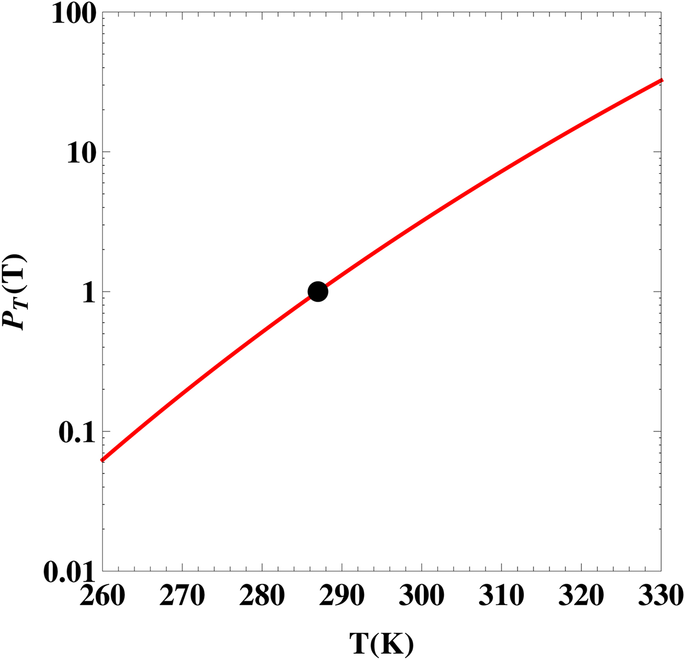Fig. 1. The likelihood as a function of the planet's average surface temperature T. The black dot represents the Earth's value at T = 287 K.