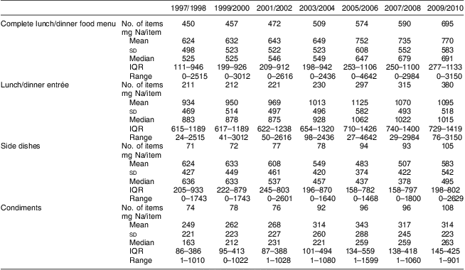 Across the eight restaurants mean Na content of menu offerings increased by 23·4 % over the 14 years studied (Table 2). The mean Na content of entrées increased by 17·2 %, from 934 mg Na/item to 1095 mg Na/item. The mean Na content of side dishes decreased by 6·6 %, from 624 mg Na/item to 583 mg Na/item. Side dishes, which included fruit offerings and side salads, was the only sub-category of food that showed a reduction in Na. It should be noted that salad dressings and fruit dipping sauces were included in the condiment sub-category which showed a 26·1 % increase in mean Na, from 249 mg Na/item to 314 mg Na/item.
