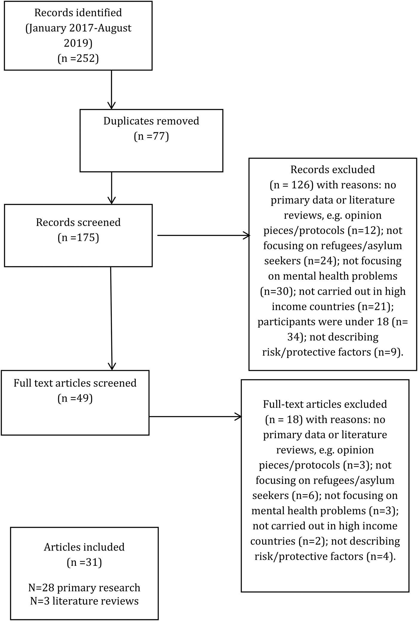 - (d) low- and middle-income countries were excluded because it was felt that examining the risk and protective factors for mental health in these countries would justify a specific review study. There is an increasing amount of studies exploring the mental health of asylum seekers and refugees in low- and middle-income countries. Twenty-three papers have been written in this area in the last two and a half years and had to be excluded from this review (see Fig. 2). Moreover, in low- and middle-income countries, additional factors might intervene which may complicate the categorisation proposed. A particular issue is that some of these countries can be deemed as ‘transit countries’. Migrants expect to only spend some time in transit countries in preparation of reaching the planned final destinations. Recent studies have found high rates of mental disorders in transit countries (Arsenijevic et al., Reference Arsenijevic, Schillberg, Ponthieu, Malvisi, Ahmed, Argenziano, Zamatto, Burroughs, Severy, Hebting, de Vingne, Harries, Beiser and Hou2017; Vukčević Marković et al., Reference Vukčević Marković, Gašić and Bjekić2017; WHO, 2018) and specific studies are required to understand in detail why this is. Moreover, a difficult financial situation in the host country might make the process of integration of refugees even more difficult and challenging.