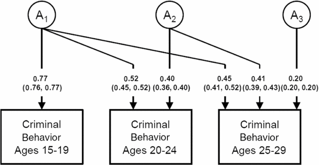 FIGURE 1 Parameter estimates (and SEs) for the genetic effects from the full Cholesky Model for Criminal Behavior at ages 15–19, 20–24, and 25–29 in Swedish male–male twin and near-aged sibling pairs. ‘A’ refers to additive genetic factors, with the subscripts 1, 2, and 3 indicating those effects that come ‘online’ at ages 15–19, 20–24, and 25–29, respectively.