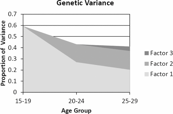 The parameter estimates and SEs for the genetic effects from our full Cholesky model are depicted in Figure 1. As illustrated in Figure 2, a robust first genetic factor impacts strongly on liability to CB at ages 15–19 but also has a sustained but declining influence at ages 20–24 and 25–29. A second major genetic factor begins at ages 20–24 which also has essentially the same impact at ages 25–29. By contrast, the third genetic factor is very modest in its effect, accounting for only 4% of the variable in liability to CB at ages 25–29. We see, in aggregate, evidence for both genetic innovation and attenuation for CB.