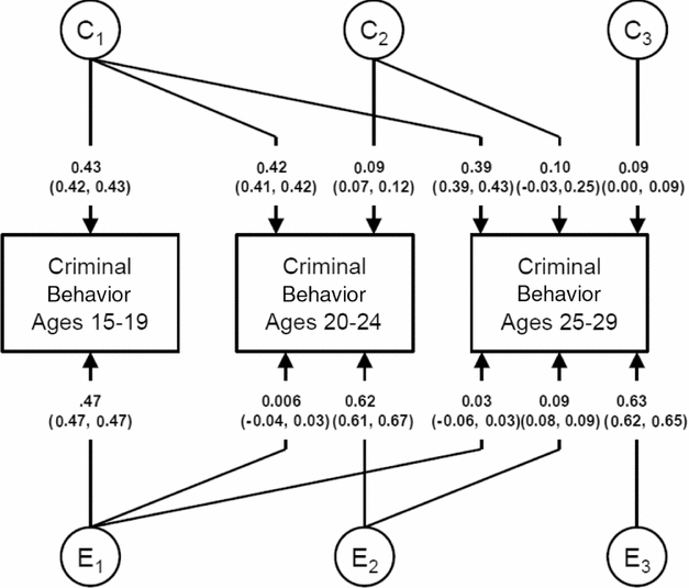 FIGURE 3 Parameter estimates (and SEs) for the shared and individual-specific environmental effects from the full Cholesky model for criminal behavior at ages 15–19, 20–24, and 25–29 in Swedish male–male twin and near-aged sibling pairs. C and E refer, respectively, to shared and individual-specific environmental factors, with the subscripts 1, 2, and 3 indicating those effects that come ‘online’ at ages 15–19, 20–24, and 25–29 respectively.