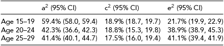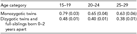 For our entire twin-sibling sample, the within-individual cross-time tetrachoric correlations (±SE) for CB from ages 15–19 to 20–24, 15–19 to 25–29, and 20–24 to 25–29 were, respectively, +0.58 (0.01), +0.53 (0.01), and +0.63 (0.01). We see substantial within-individual stability in CB over these 15 years.