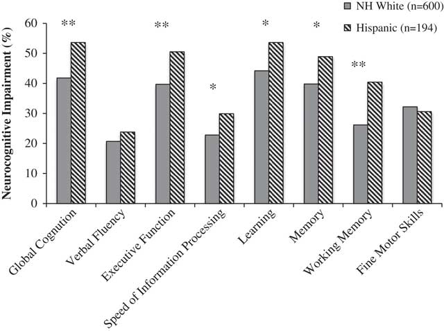 Fig. 1 Rates of global and domain neurocognitive impairment among HIV+ Latinos and Whites. *p<.01; **p<.001.